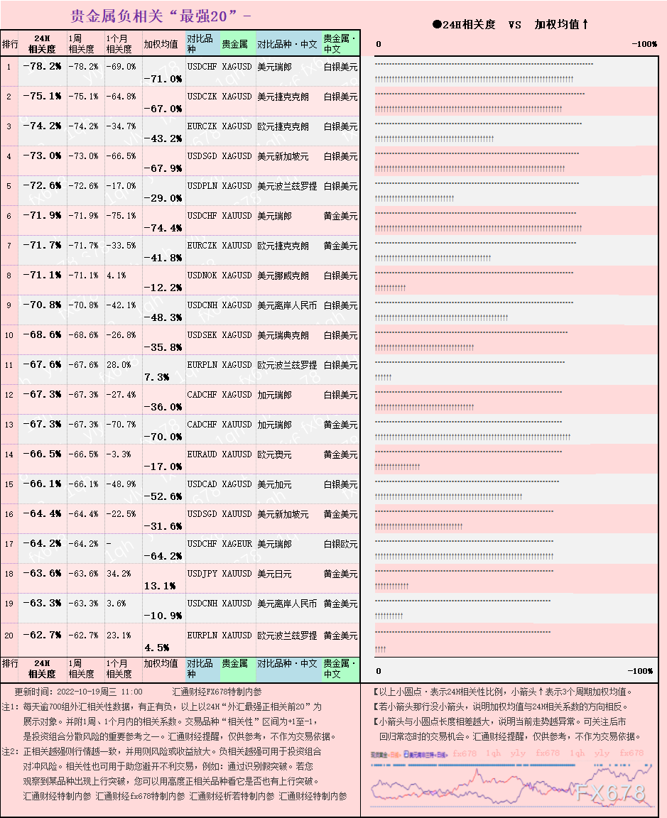 如下图4:【贵金属VS外汇的负相关】最强前三个分别是:美元瑞郎(USDCHF) VS 白银美元(XAGUSD)的“负相关”强度达到-78.20%。美元捷克克朗(USDCZK) VS 白银美元(XAGUSD)的“负相关”强度达到-75.10%。欧元捷克克朗(EURCZK) VS 白银美元(XAGUSD)的“负相关”强度达到-74.20%。汇通财经提醒,更多参考本文表格。