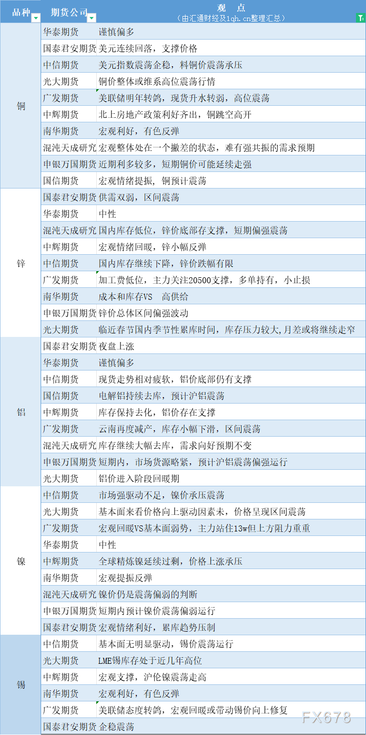 期货公司观点汇总一张图:12月15日有色系(铜、锌、铝、镍、锡等)