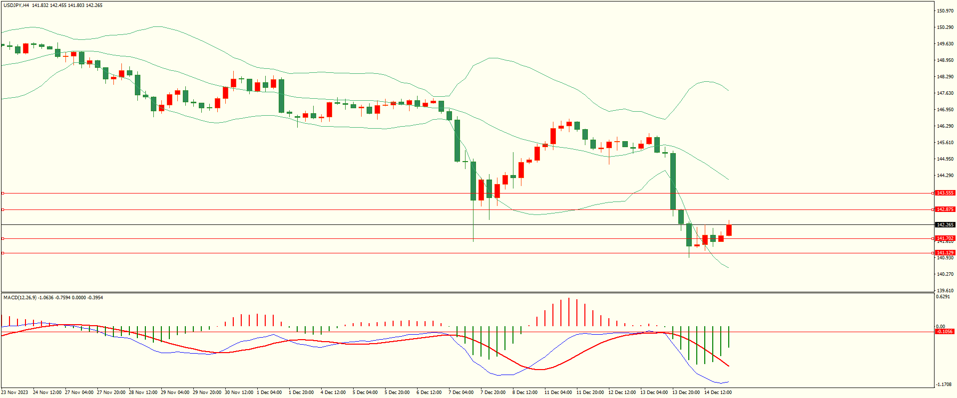 美日昨日亚市开盘后继续走低,盘中触及第一支撑后跌势缓和,日线报收下影线中阴线,下方支撑保持,同时上方面临多重阻力,短线走震荡概率较高,从4H来看,布林中轨偏下,MACD零轴下方运行,日内上方首要阻力142.85,第二阻力143.50,下方支撑141.70,141.10-20,保持在第一阻力下方短线有望回测第一支撑。