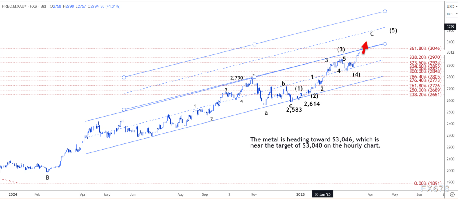 路透技术分析师周二指出,在强劲的 C 浪推动下,现货黄金可能攀升至每盎司 3040 美元。