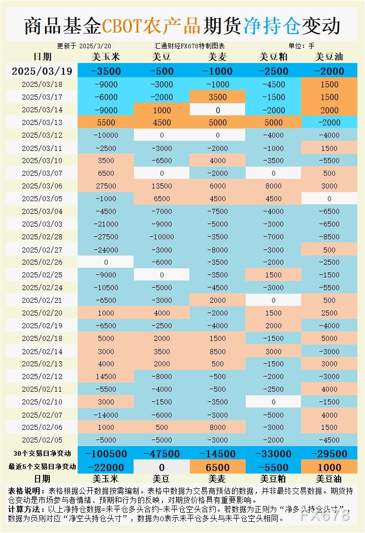 增加CBOT玉米投机性净空头;CBOT大豆未平仓多头与未平仓空头相同;增加CBOT小麦投机性净多头;增加CBOT豆粕投机性净空头;增加CBOT豆油投机性净多头;