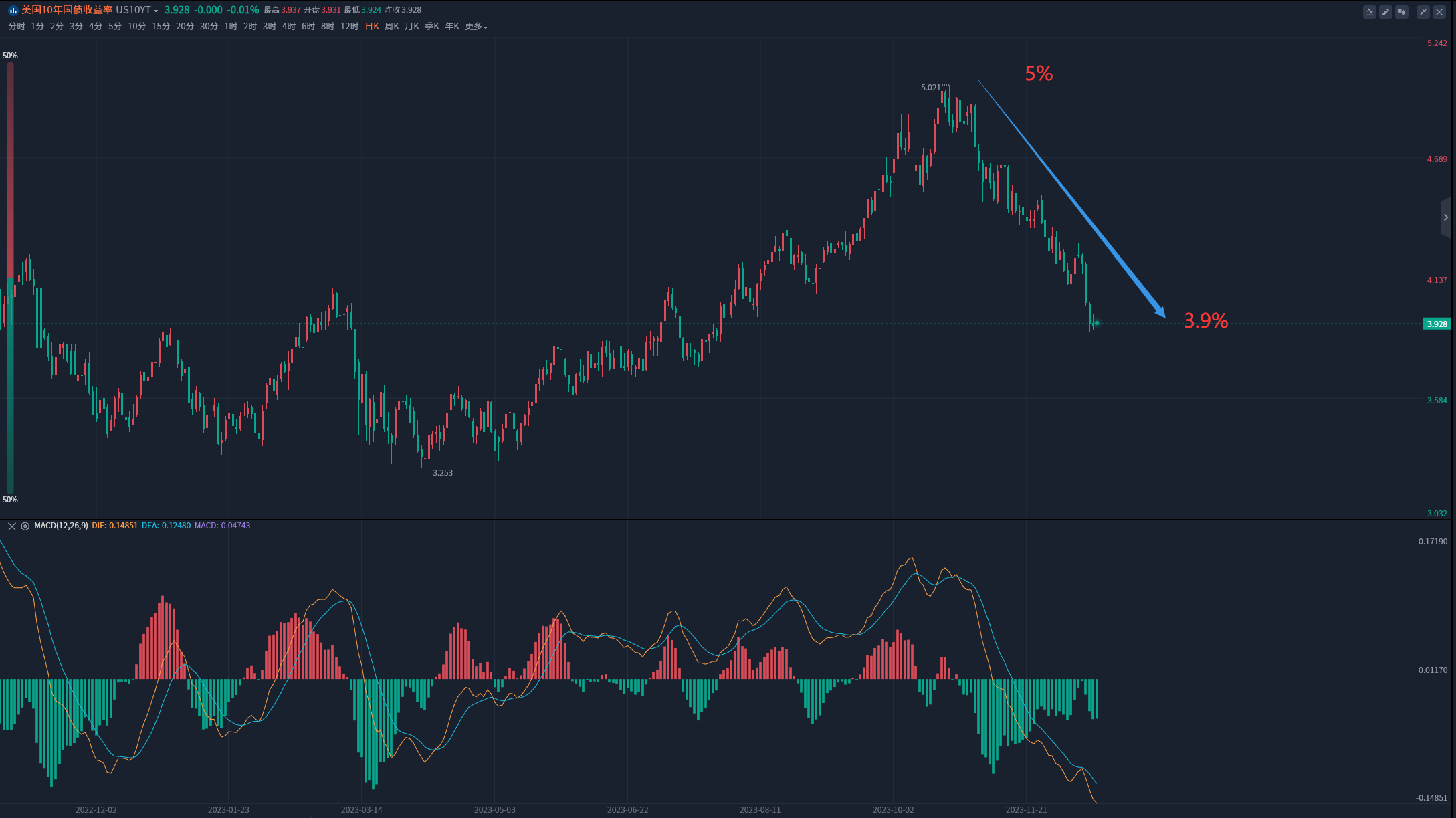 另外在加息周期内我给大家强调的一个观点就是,美国的实际利率涨跌影响着黄金的价格表现。现在来看也不矛盾,只是市场复杂到多加入了一种对未来货币政策调整的预期情绪存在。粉丝可能说了,你总是说通胀跌,黄金跌。现在通胀确实跌下来了,金价为啥还在高位呢?我再说这个观点的前提是美国的长期债券收益率不变的前提下,才会有上边说的规律