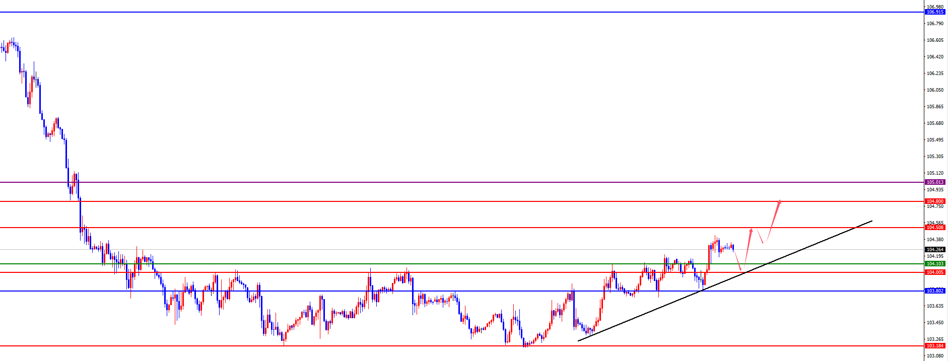 美元指数方面,周一美元指数价格总体呈现上涨的状态。当日价格最高上涨至104.422位置,最低于103.814位置,收盘于104.285位置。回顾周一美指价格表现,早间开盘后价格短线先承压下跌,随后价格正如笔者所言测试到103.80-90区域止步后上涨,从时间点看是美盘前拉升,并且之后美盘再度延续上涨再创上周高点位置,最终日线大阳收尾。目前看从周线上持续关注106.90区域,此位置是中线走势的分水岭。日线上价格在上周五已经突破并站稳,同时周一再度回踩拉升给予确认,所以后续价格在103.80位置上方则波段多对待。短线四小时上暂时需要关注104.00-104.10区间支撑,待后续价格到位后再关注进一步上攻,上方短线关注104.50-104.90区域阻力。