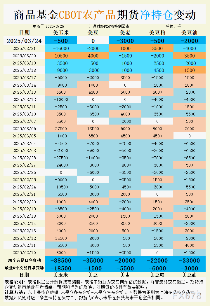 周二(3月25日),CBOT谷物期货市场在周一(3月24日)呈现分化走势,小麦期货因俄乌局势谈判进展和美元走强承压明显,而玉米和大豆则在窄幅震荡中寻找方向。持仓数据方面,最新交易商预估显示,大宗商品基金在3月24日继续增加玉米、小麦、豆粕和豆油的净空头持仓,仅大豆维持净多头与净空头持平。过去5个交易日和30个交易日的持仓趋势也表明,基金对谷物市场的看空情绪持续加深。这种情绪叠加基差变化、国际交易动态以及即将于3月31日发布的USDA谷物库存和预期种植报告,短期内市场的不确定性正在放大。当前,CBOT 5月小麦期货结算价为5.48-1/4美元/蒲式耳,下跌10美分;5月玉米期货收于4.64-1/2美元/蒲式耳,微涨1/4美分;5月大豆期货报10.07-1/4美元/蒲式耳,下跌2-1/2美分;5月豆粕期货跌至298.1美元/短吨,下挫2.2美元;5月豆油期货则因空头增仓承压。