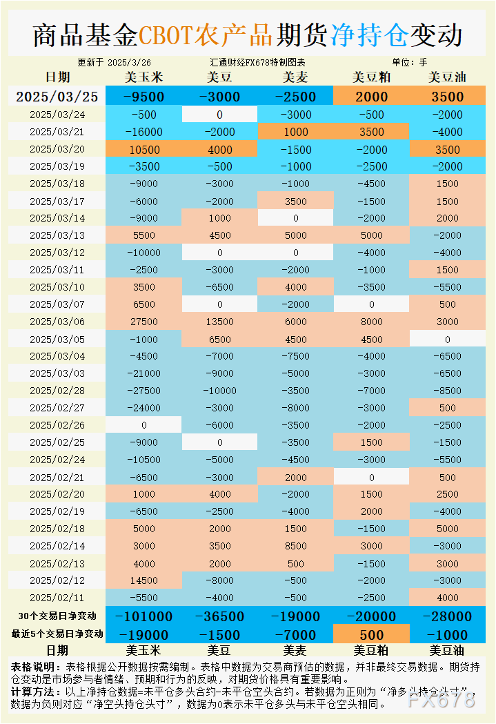 周三(3月26日),CBOT期货市场继续承压,受到多重因素的影响。大宗商品基金对CBOT谷物期货持仓呈现明显的净空头态势,尤其是在玉米、大豆和小麦等主要谷物品种上。与此同时,豆粕和豆油的净多头头寸有所上升,表明市场情绪的分歧。随着春季播种季节的临近,农业报告即将发布,投资者的焦虑情绪仍在增加。