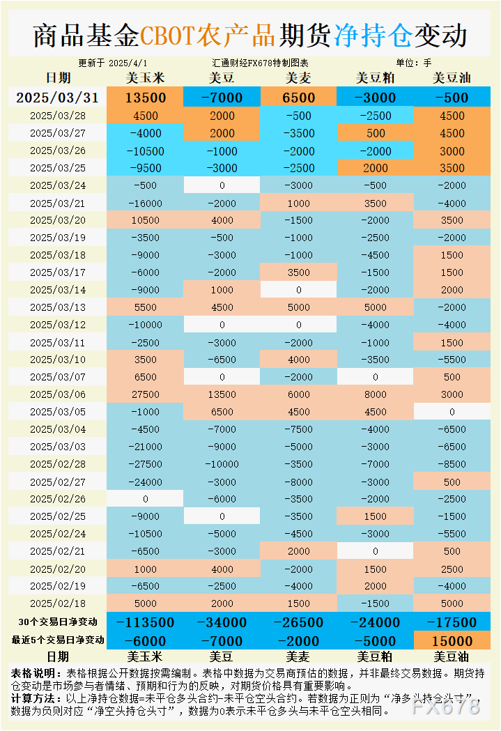 持仓变动:3月31日商品基金净增玉米多头13,500手,结束连续5日净空头趋势,但30日累计净空头仍达113,500手,反映市场对丰产预期的长期担忧。