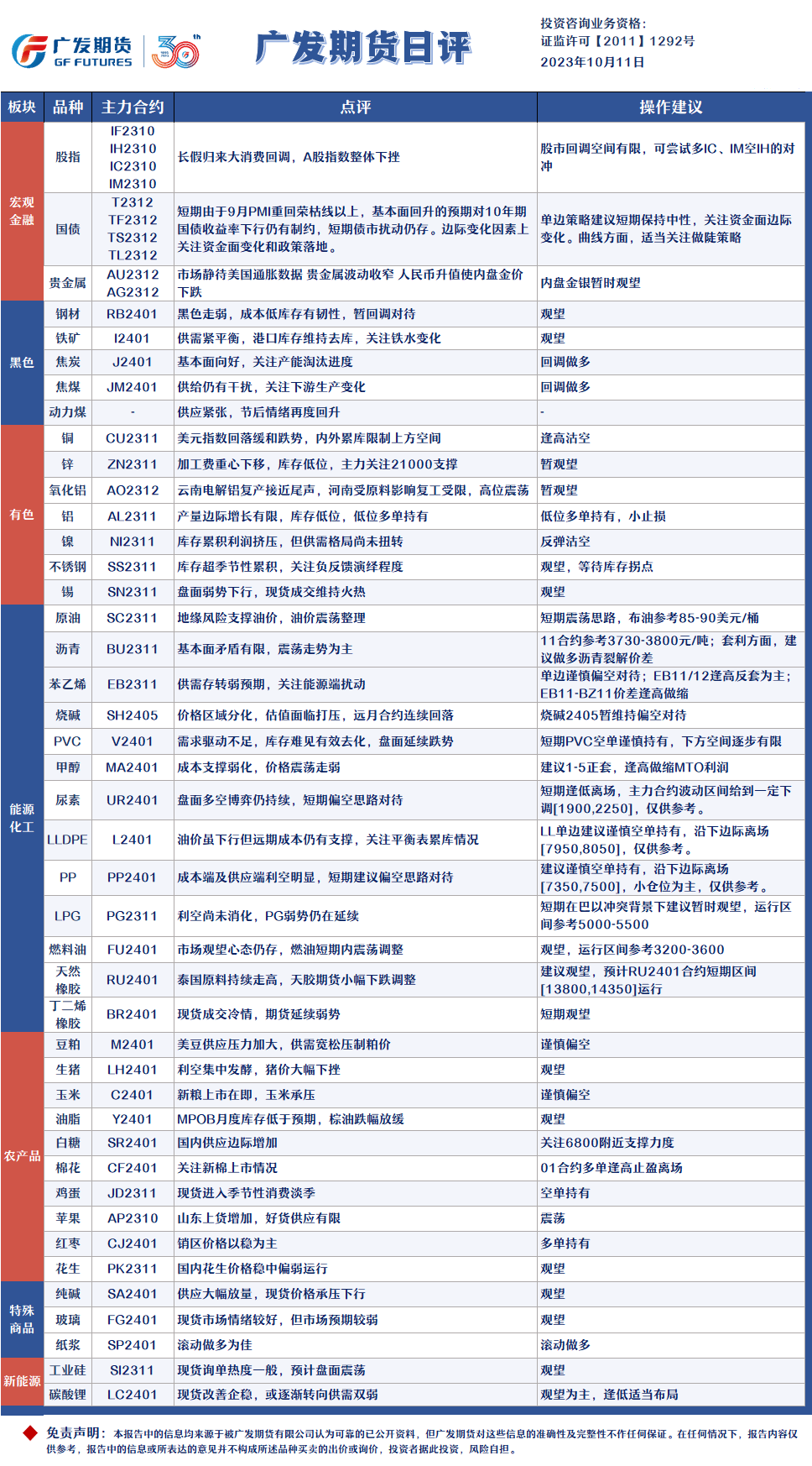 广发期货发布10月11日日评,建议内盘金银暂时观望,煤焦回调做多,铜逢高沽空,铝低位多单持有,小止损;原油短期震荡思路,布油参考85-90美元;豆粕和玉米谨慎偏空。