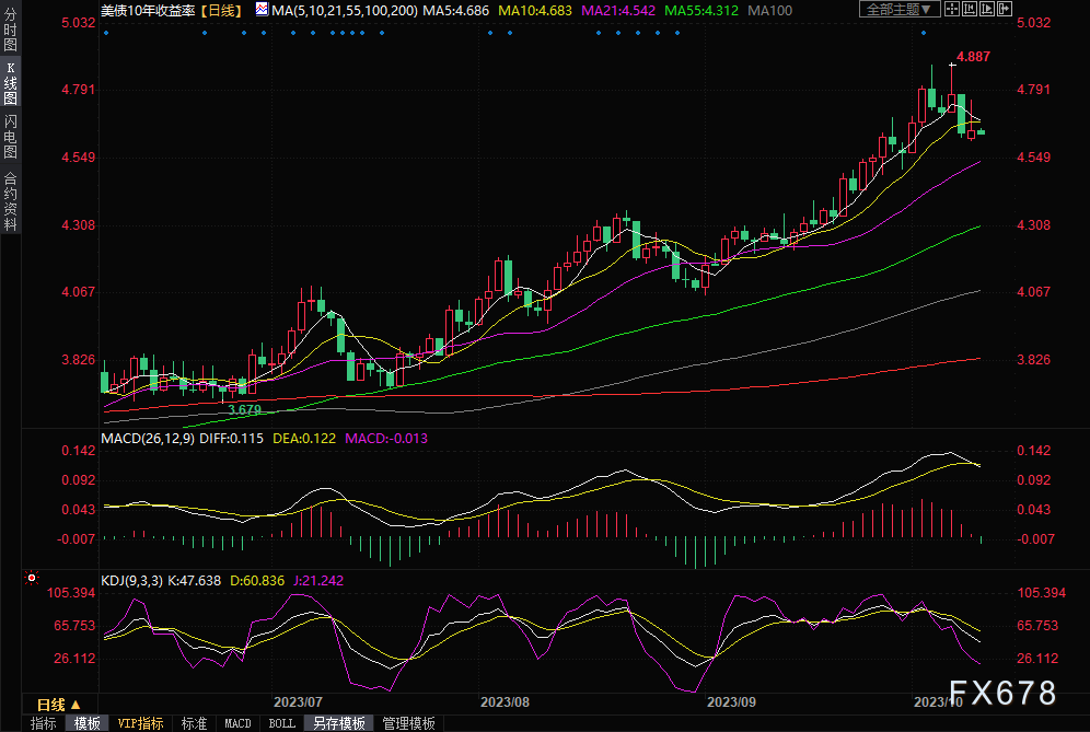 美国国债(10年期)收益率在疫情后迅速上升的情况。在疫情前,自2011年以来,10年期美国国债收益率在3%以上的水平上停留的时间并不多。然而,在过去的一年里,这一收益率在3.2%到近4.9%的范围内波动。尽管在周二的交易中,10年期和30年期美国国债的收益率略有回落,但仍然保持在接近2007年以来的高位附近。