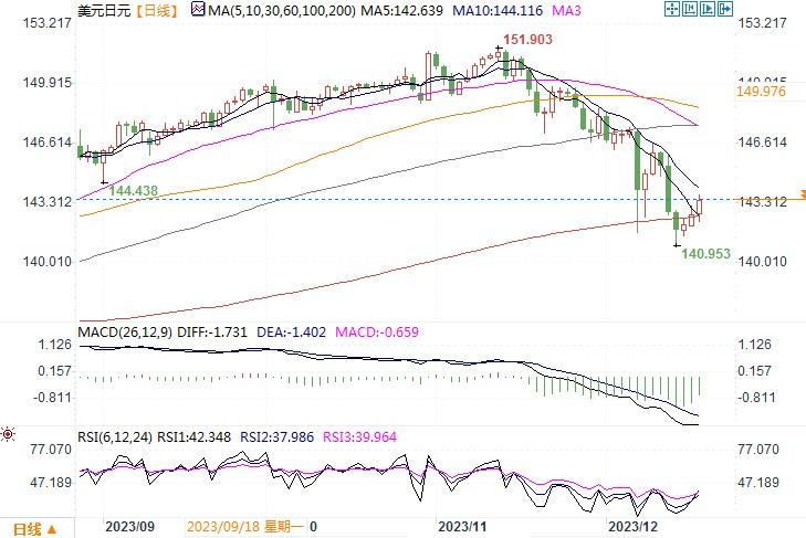 周一(12月18),美元兑日元纽约盘尾上涨0.51%,报142.74。进入本周,众多美联储重要官员纷纷发言反驳了金融市场关于美联储将转向降息的预期。美元周一因此稍稍得到些许的喘息机会。日本央行从周一开始了为期两天的会议,这次会议可能对决定该央行结束超宽松利率立场的时间至关重要。市场难以确定日本央行多久才能逐步退出负利率政策,日本央行总裁植田和男本月的发言最初推动日元大幅上涨。涨势后来逆转,有消息称日本不太可能最早在12月转变政策。投资者现在正等待日本央行周二的决定,以进一步明确该央行的利率前景。不过,自11月触及152日元附近的数十年低位以来,日元兑美元已经上涨约6%,交易员开始愈发相信日本央行低利率给日元造成的拖累不会持续太久。而且这种人气的转变无疑会受到日本央行的欢迎,在明天的利率决议公布前,这在一定程度上帮助他们应对了日元疲软的问题。本次会议上,只要不表露出维持宽松的意愿。那么对于日元有望结束负利率的预期就不会消退。那么日元也有望保持住近期形成的强势。若情况相反,美元/日元的空头回补修复性行情将会得到延续。日内密切留意来自日本央行利率会议的任何消息。