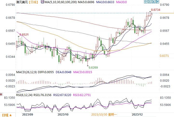 周一(12月18日),澳元/美元继续稳定在近期的高位附近,当日收盘在0.6707。此前美国利率预期的转变助涨澳元/美元升至近五个月高点,市场目前认为通胀放缓意味着美联储将不得不放宽政策,并押注明年将尽早采取激进行动,降息幅度有望达到约150个基点。 但是进入本周,随着一众美联储重要官员纷纷发表讲话反驳金融市场对于利率转向的预期,令市场对利率转趋下降的预期有所冷静。澳元/美元的上升动力也因此有所减弱。但从日线图上观察,澳元/日元并未因美联储诸多官员的言论出现下跌之势。走势形态仍紧贴布林带通道上轨线呈上行趋向,各类技术指标仍保持上扬态势。显示澳元多头仍占优。目前下方初步支撑在0.6650附近,上方若进一步上攻的初步目标将瞄向0.6800。