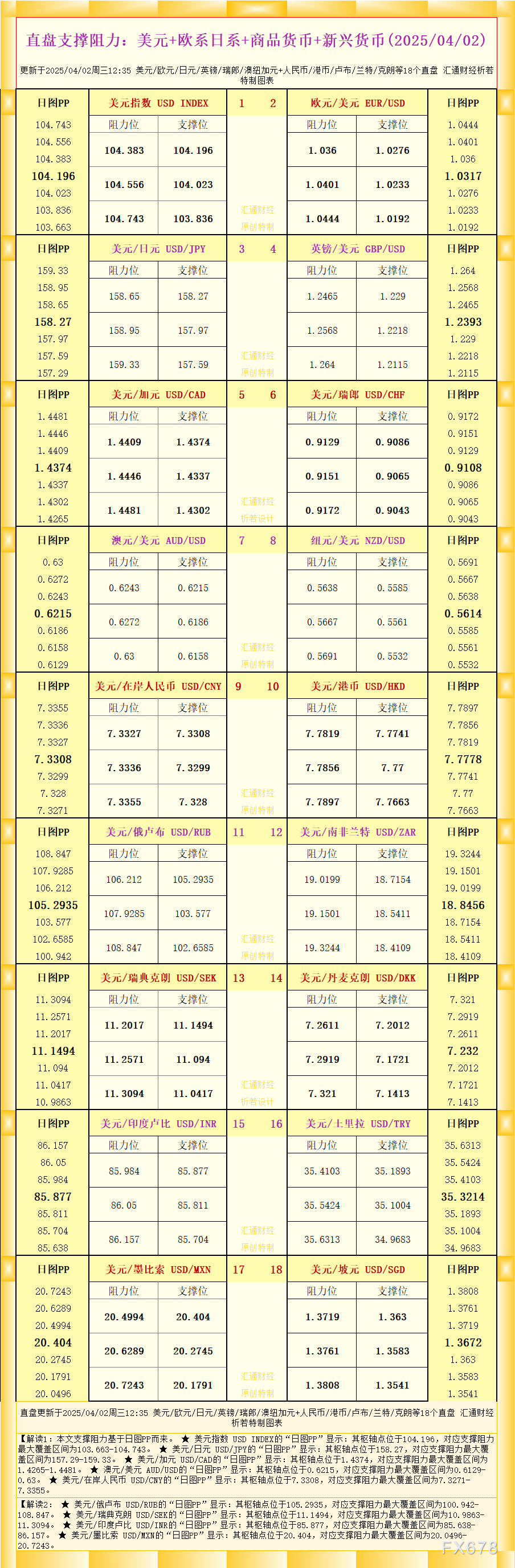 FXTM富拓官网:一张图看18个直盘外汇支撑阻力:美元+欧系日系+商品货币+新兴货币(2025/04/02)