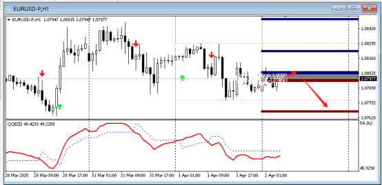 目前QE箭头向下,代表空头强劲,预示行情向下的概率大,故而可以采取高空的策略,可以在15分钟寻找做空信号,第一压力位置:1.0809。下方支撑1.0768