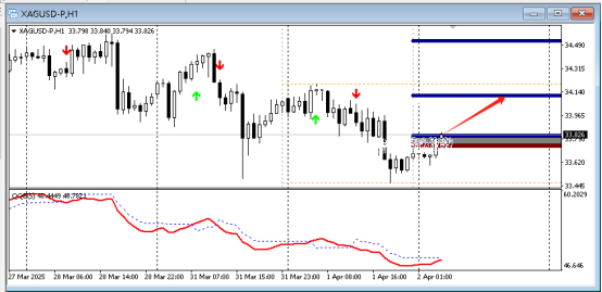 目前QE箭头向下,代表空头强劲,预示行情向下的概率大,故而可以采取高空的策略,可以在15分钟寻找做空信号,第一压力位置:33.97。下方支撑33.46