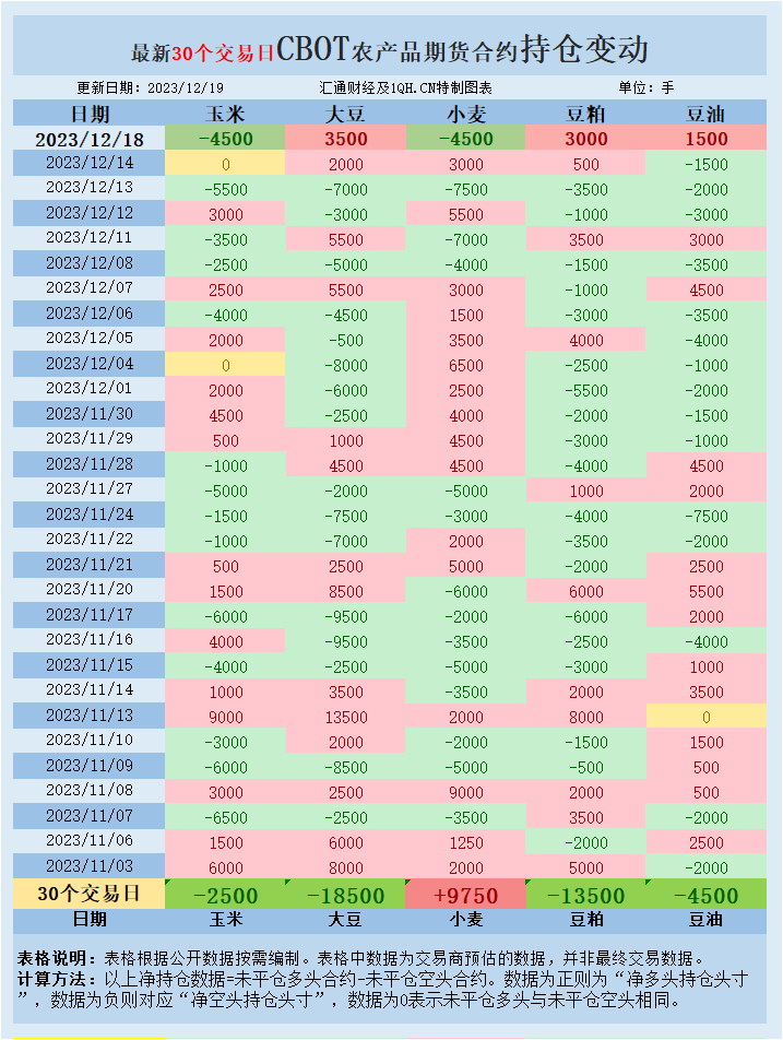 交易商估算的结果显示,大宗商品基金本周一(12月18日)增加大豆、豆粕、豆油投机性净多头头寸,增加玉米、小麦投机性净空头头寸。最新30个交易日,大宗商品基金增加豆油、玉米、豆粕、大豆、投机性净空头头寸,增加小麦投机性净多头头寸。
