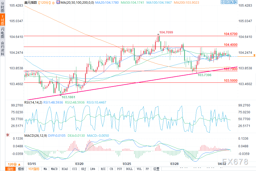 周三(4月2日)欧洲时段,美元指数(DXY)徘徊在104.19附近,交易员们评估最新经济数据的复杂信号,美元指数波动有限。
