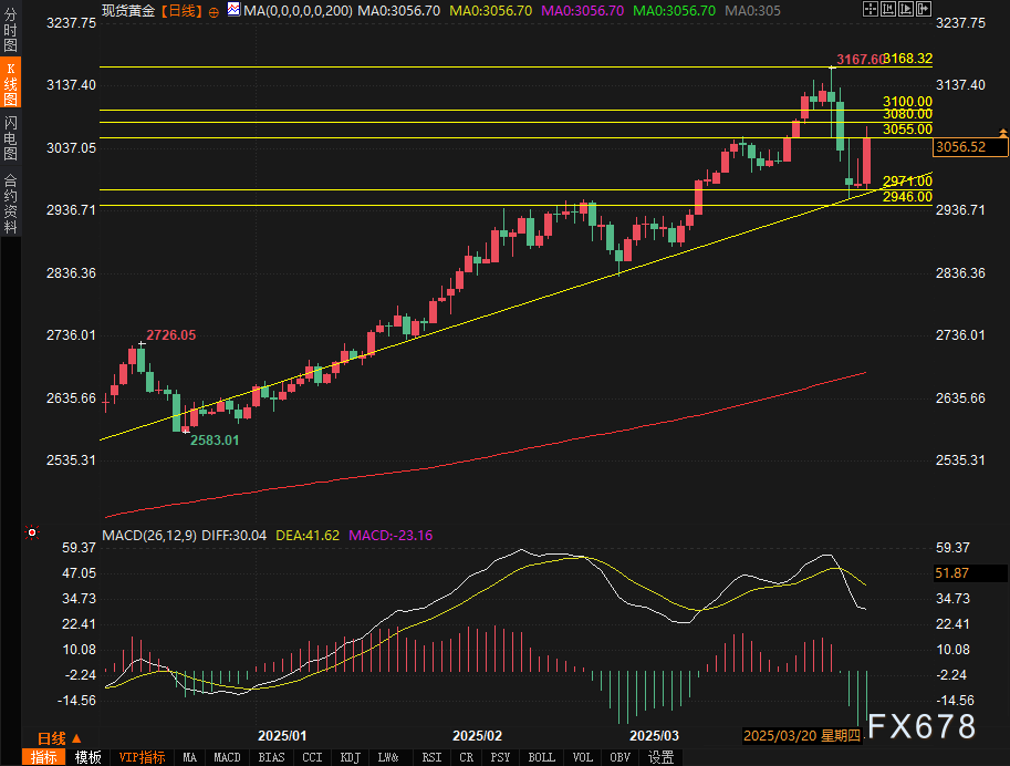 下方防御: 3004美元(3月14日高点)与3000美元心理关口构成第一支撑带,失守则可能下探2964美元(S1支撑)及2955美元(周一低吸买盘密集区)。55日均线2935美元为中期强弱分水岭。