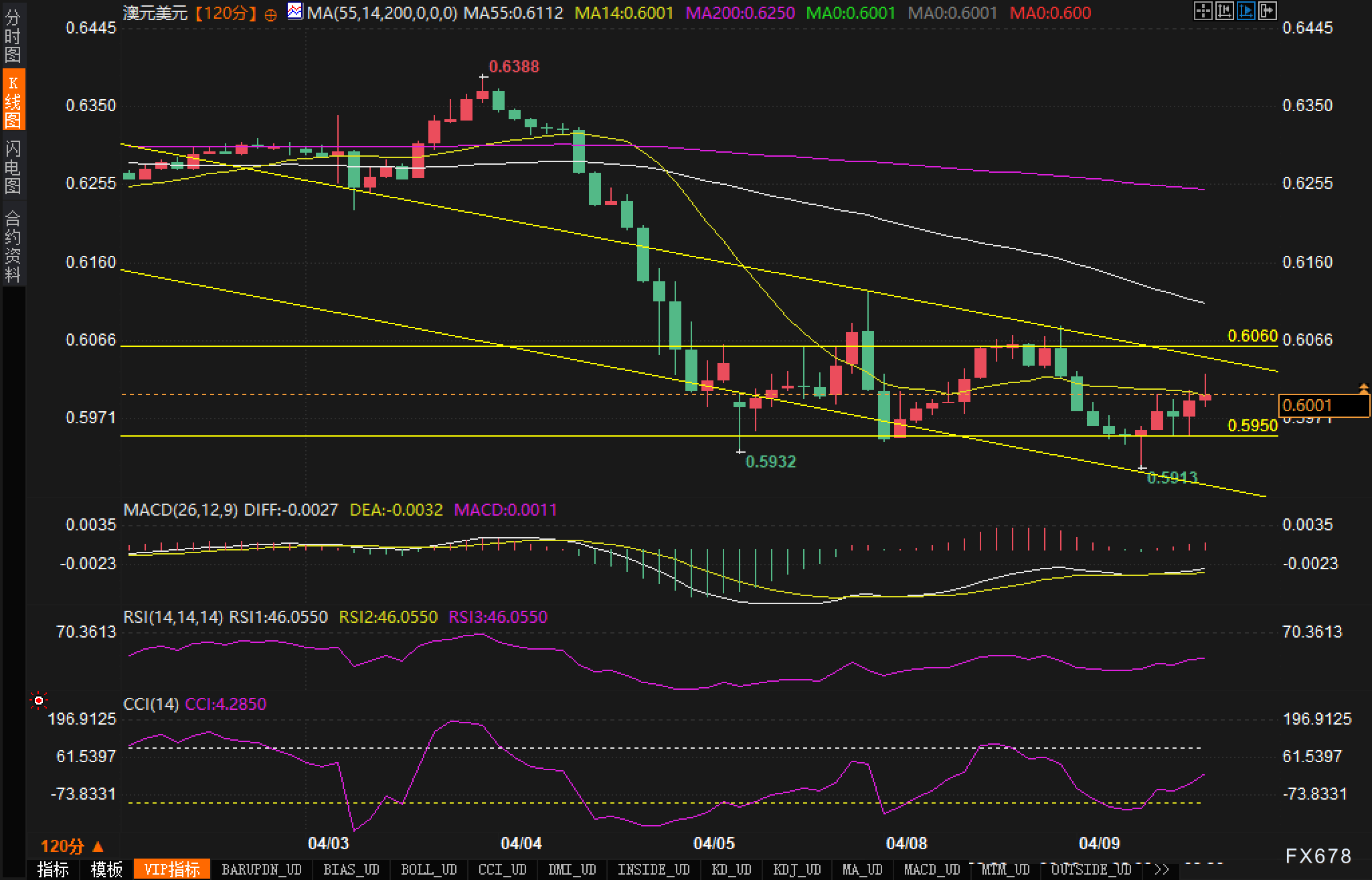 120分钟图显示,澳元/美元汇价自0.6388高点形成明显下降趋势,创造了一系列较低高点和较低低点。目前汇价已跌破0.6060关键支撑,暗示短期下行压力持续。从均线系统来看,MA55(0.6112)明显向下倾斜,汇价交投于主要均线下方,显示空头主导市场。MACD指标在零轴下方运行,DIFF线(-0.0027)与DEA线(-0.0032)距离扩大,但值得注意的是MACD柱状图已开始缩短,这可能暗示下行动能减弱。RSI指标在46.0550水平徘徊,尚未达到超卖区域,表明还有进一步下行空间。