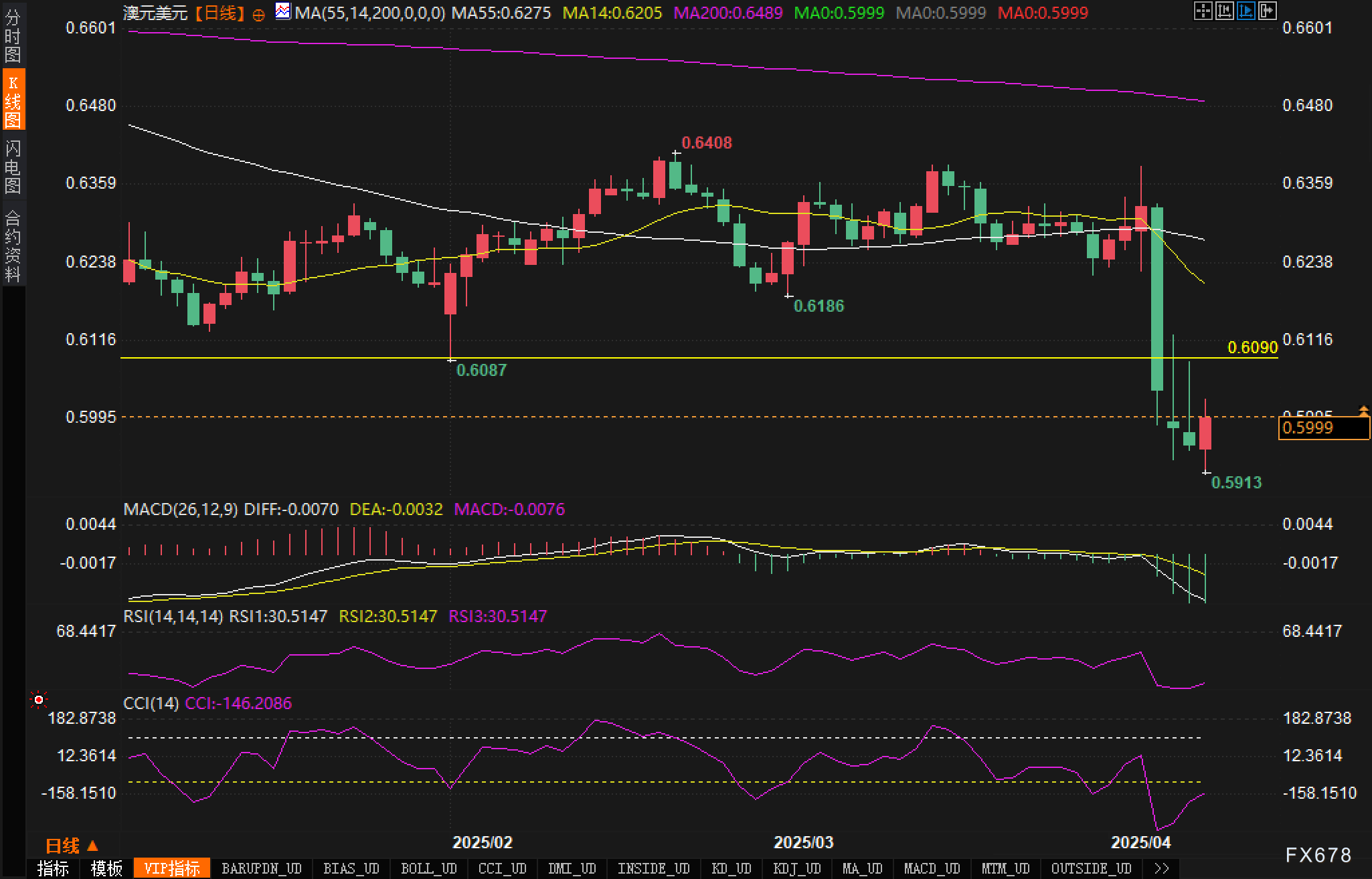 日线图上,澳元/美元汇价形成了明显的下降楔形形态,汇价最近从楔形下边界反弹,但随后又跌穿了关键支撑位0.6000,最低触及0.5913。MA55(0.6275)和MA200(0.6489)均向下倾斜,增强了下行趋势的确立。RSI指标已降至30.5147的超卖区域,这通常是潜在反弹信号。然而,MACD指标显示死叉形态加深,DIFF线(-0.0070)与DEA线(-0.0032)距离进一步扩大,柱状图呈现绿色且体积增大,表明下行压力仍然存在。CCI指标跌至极端超卖区域-146.2086,这种极端读数往往会引发短期技术性反弹。