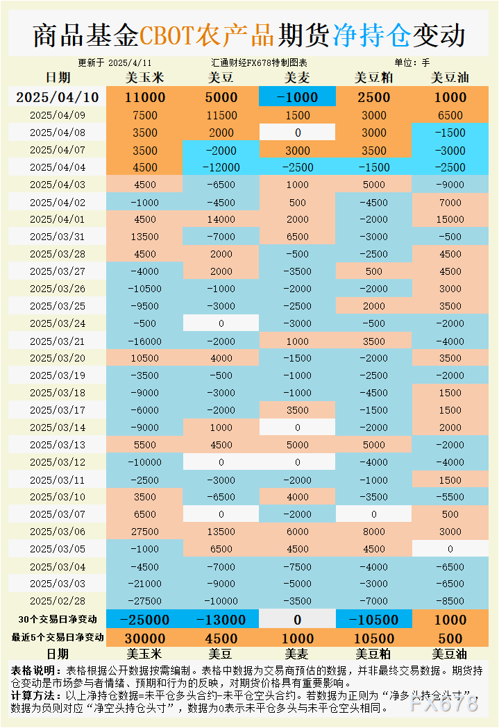 周五(4月11日),芝加哥期货交易所(CBOT)谷物期货市场呈现分化走势,市场情绪在基本面数据、持仓变动以及国际交易动态的交织下显得复杂多变。美国农业部(USDA)最新供需报告下调玉米和大豆库存预期,提振了玉米和大豆期货价格,而小麦因库存上调承压下行。豆油和豆粕则在出口需求与供应节奏的博弈中波动。持仓数据反映出资金对玉米、大豆和豆粕的看多情绪升温,但对小麦的看空态度加剧,豆油则维持谨慎乐观。结合基差动态和国际市场消息,本文将深入分析各品种的持仓变动、市场情绪及其对未来走势的指引。
