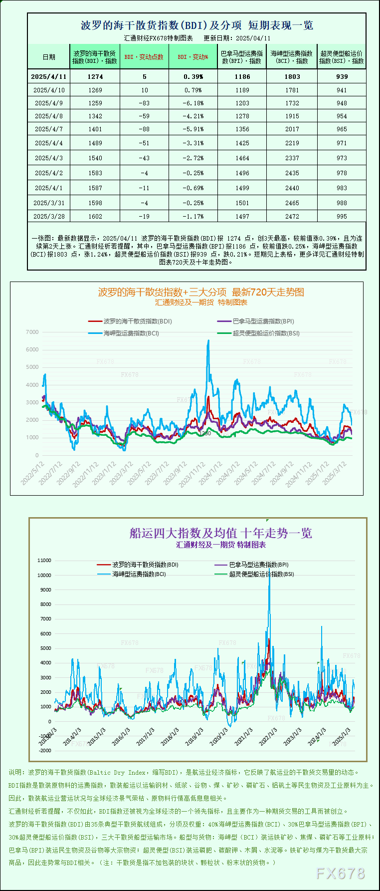 最新数据显示,2025/04/11 波罗的海干散货指数(BDI)报 1274 点,创3天最高,较前值涨0.39%,且为连续第2天上涨。其中,巴拿马型运费指数(BPI)报1186 点,较前值跌0.25%,海岬型运费指数(BCI)报1803 点,涨1.24%,超灵便型船运价指数(BSI)报939 点,跌0.21%。波罗的海干散货指数+三大分项的最新720天走势图、十年走势图等详见汇通财经特制图表。