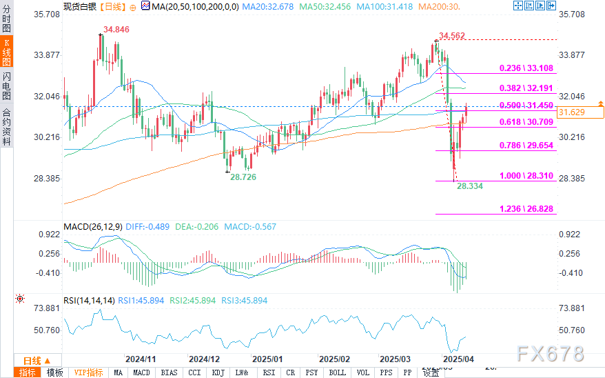 周五(4月11日)欧盘时段,白银价格上涨,受技术面走强和广泛的避险需求推动。随着黄金飙升至3200美元上方的新高,白银也随之上涨,试探关键的回撤位,这可能为银价进一步上涨打开大门。交易员的关注点依然集中在主要支撑位和阻力位附近的价格走势上。