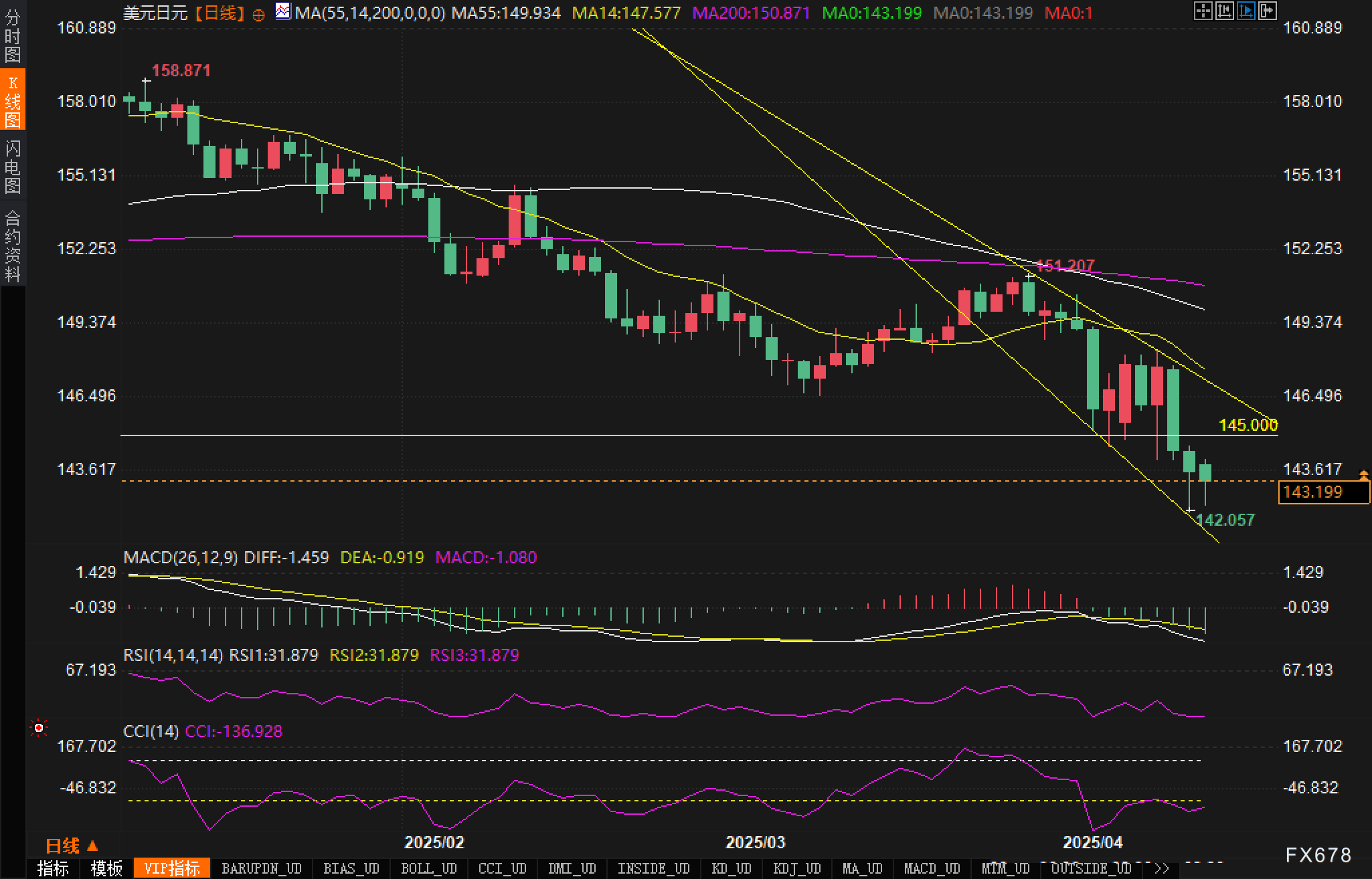 从日线图分析,美元兑日元自158.871高点以来形成清晰的下降趋势,近期跌破145.000重要支撑后进一步加速下行。MACD指标中,DIFF为-1.459,DEA为-0.919,MACD值为-1.080,柱状体继续位于零轴下方并有扩大趋势,表明中期下行动能仍然强劲。RSI指标为31.879,接近超卖区域但尚未进入,表明短期内可能出现技术性反弹。均线系统中,MA55位于149.934,MA14位于147.577,MA200位于150.871,均线空头排列明显,表明下降趋势仍在持续。当前汇价已出现超卖迹象,短期可能出现技术性反弹,但中长期下行趋势未变。若汇价站稳143.880水平,则可能反弹至145.000-146.000区间;若继续下破142.000心理关口,则可能进一步下探140.000整数关口。