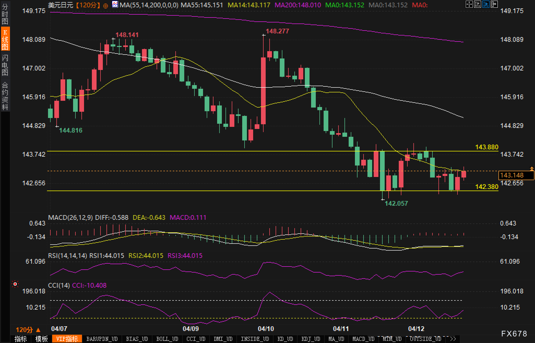 从120分钟图来看,美元兑日元正处于明显的下降通道中,近期在142.057的低点附近获得支撑后出现技术性反弹,但整体仍维持空头格局。MACD指标显示DIFF值为-0.588,DEA值为-0.643,MACD值为0.111,虽然柱状图有所收敛,但仍处于零轴下方,表明短期下行动能虽有减弱但尚未扭转。RSI指标处于44.015水平,位于中性区域偏下位置,显示汇价超卖风险已有所缓解,但尚未出现明显反转信号。从均线系统看,MA55、MA14和MA200分别位于145.151、143.117和148.010,呈空头排列,进一步确认当前的下行趋势。值得注意的是,汇价目前正在142.380至143.880区间内整理,若向下突破142.057支撑位,可能加速下行;若反弹突破143.880阻力位,则可能挑战145.000心理关口。