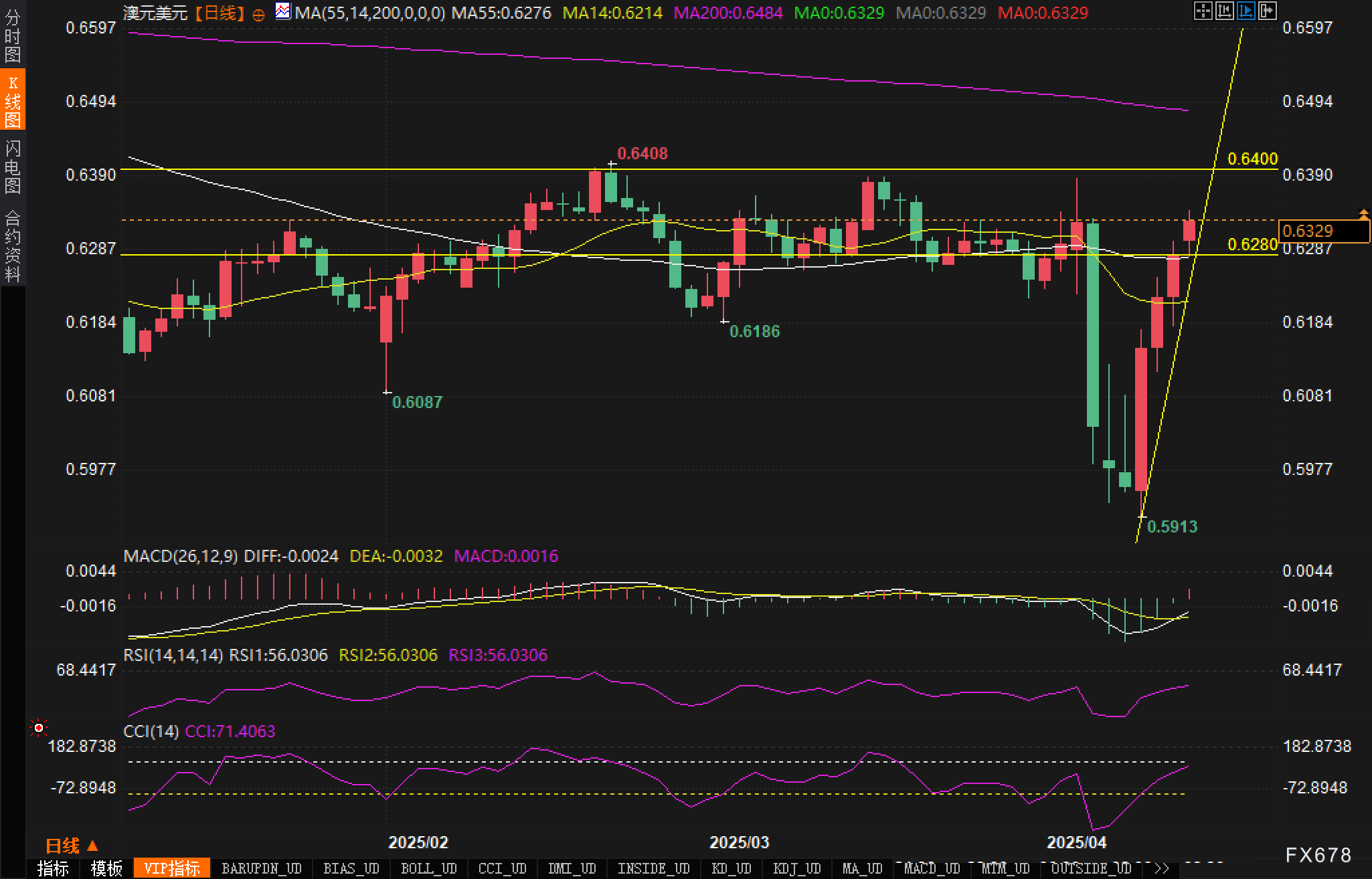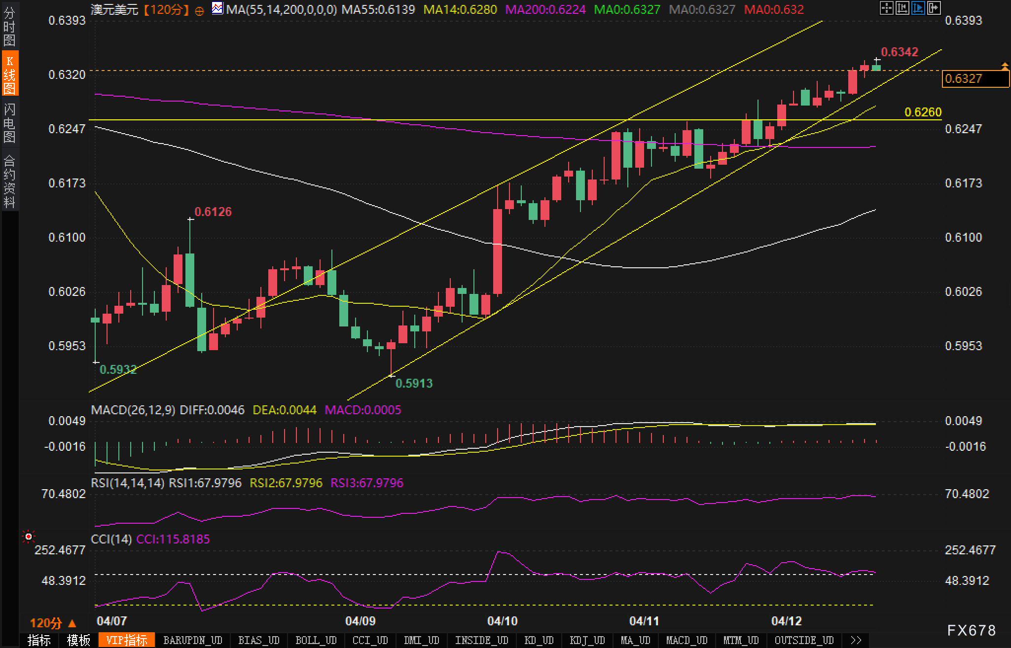 从120分钟图表来看,澳元兑美元汇价一度突破上升通道的中轨,目前正朝着0.6342的近期高点迈进。MACD指标显示DIFF为0.0046,DEA为0.0044,MACD值为0.0005,柱状图处于零轴上方,表明短期动能仍然向好。RSI指标处于67.9796的水平,接近超买区域但尚未进入,暗示短期内仍有上行空间。值得注意的是,汇价已经连续站稳各周期均线,MA55、MA14和MA200分别位于0.6139、0.6280和0.6224,形成了清晰的多头排列,这是典型的强势信号。从形态上看,汇价守稳上升通道,上行目标指向0.6400关口,支撑位分别在0.6260和0.6180附近。