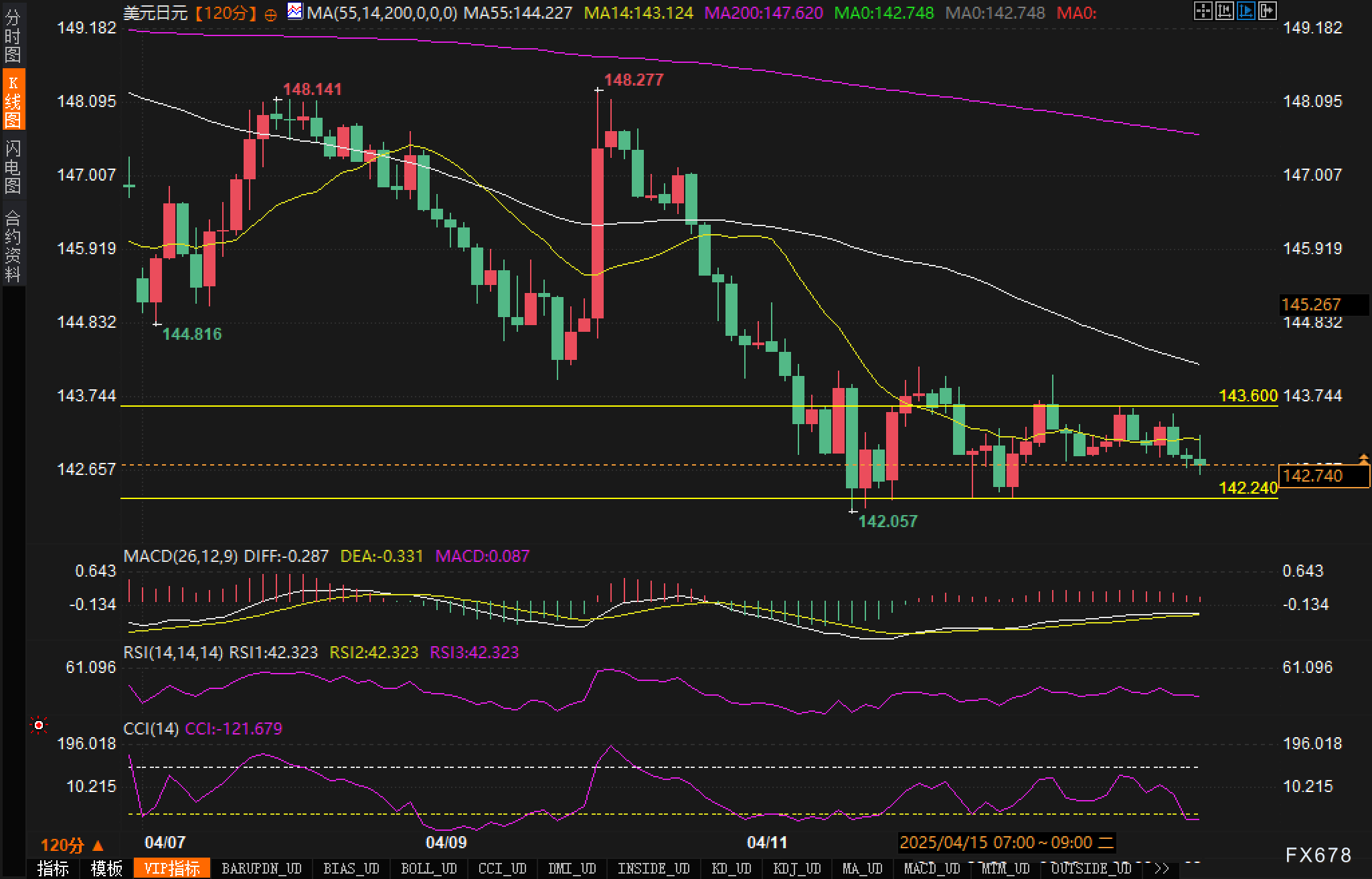 观察120分钟走势图,美元兑日元汇价近期呈现出明显的盘整态势。自4月11日以来,汇价主要在142.057至143.600区间内震荡。MA55均线位于144.227,远高于当前汇价,显示中期下行压力依然存在。MACD指标呈现DIFF-0.287、DEA-0.331的数值,虽有微弱的金叉迹象,但整体动能仍显不足。RSI指标在42.323水平,处于中性区域,表明当前没有明显的超买或超卖状态。