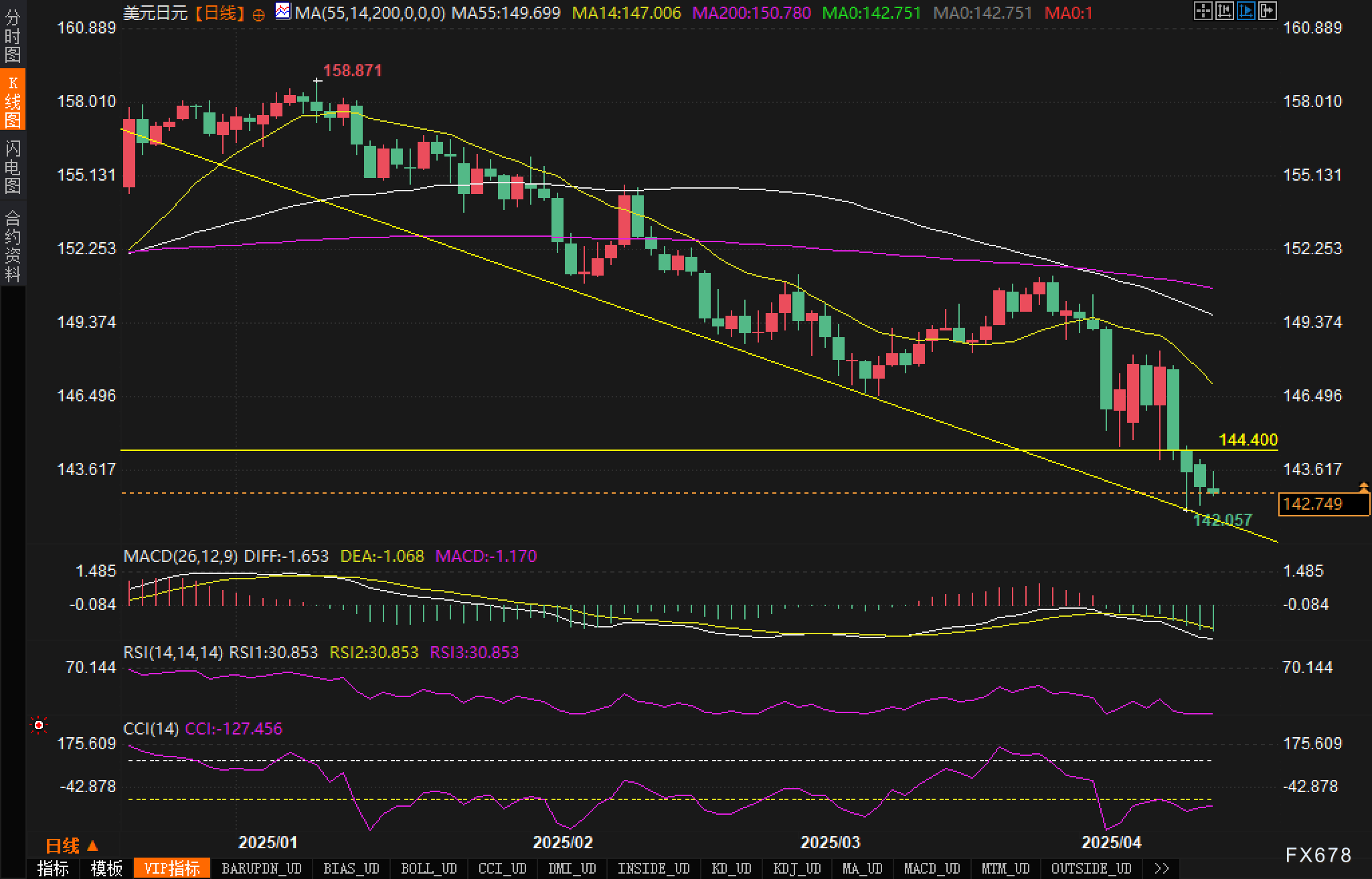 日线图技术形态更为清晰,美元兑日元呈现典型的下降通道。该通道始于2025年1月158.871的高点,至今已形成连续的下行趋势。MA55日均线位于149.699,MA200日均线处于150.780,形成双重技术阻力。特别值得注意的是,汇价已跌破重要支撑位144.400,探至142.057低点,正逼近通道下轨。RSI指标跌至30.853,接近超卖区域,暗示短期内可能出现技术性反弹。MACD指标DIFF-1.653、DEA-1.068,且柱状图向下延伸,表明下行动能仍然强劲。
