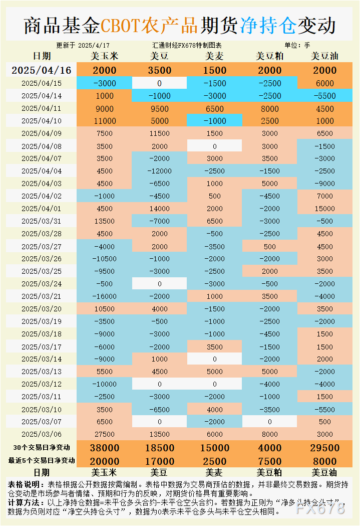 周四(4月17日),芝加哥期货交易所(CBOT)谷物期货市场延续分化走势,市场情绪受到美元走弱、美国国内种植进度以及国际交易动态的综合影响。CBOT主力合约显示,大豆期货上涨2.75美分/蒲式耳,收于10.38-3/4美元/蒲式耳;玉米期货上涨2.25美分/蒲式耳,收于4.91-3/4美元/蒲式耳;小麦期货上涨5美分/蒲式耳,收于5.61美元/蒲式耳;豆粕期货上涨2美元/短吨,收于296.20美元/短吨。持仓数据表明,商品基金在玉米、大豆、小麦、豆粕和豆油上全面增持净多头,反映市场对价格上行潜力的乐观预期。然而,南美丰产压力、美国国内物流瓶颈及国际招标动态为市场增添不确定性。以下从持仓变动、基差动态、基本面因素和国际交易角度,分析各品种的市场情绪及未来走势。