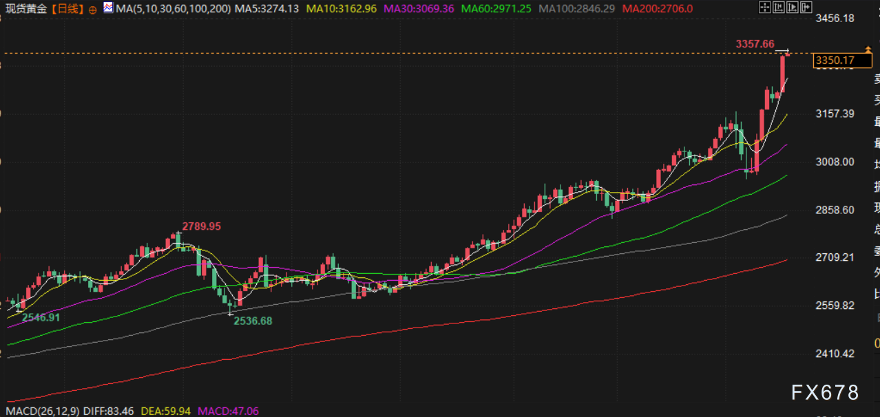 金价周三延续创纪录涨势,突破每盎司3300美元,因美元走弱和贸易紧张局势升级,促使投资者转向避险资产。现货金上涨超3.5%。美国期金上涨3.3%。