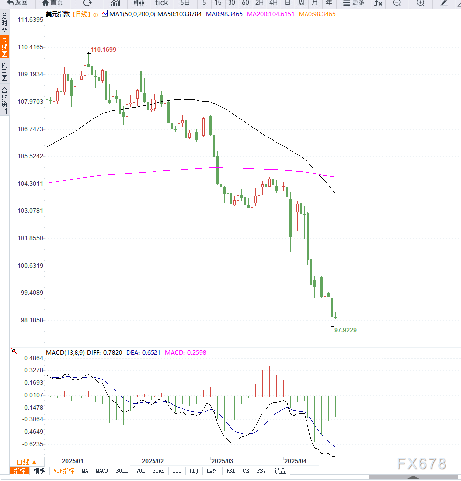 美元指数(DXY)最新报98.454,低于周一录得的97.923,为2022年3月以来最低水平,反映出美元整体在全球市场中失去支撑。