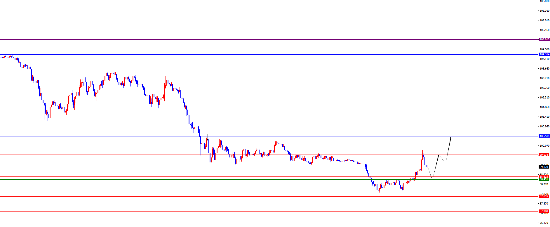 美指98.50-60区间多,防守5美金,目标99.60-100.50