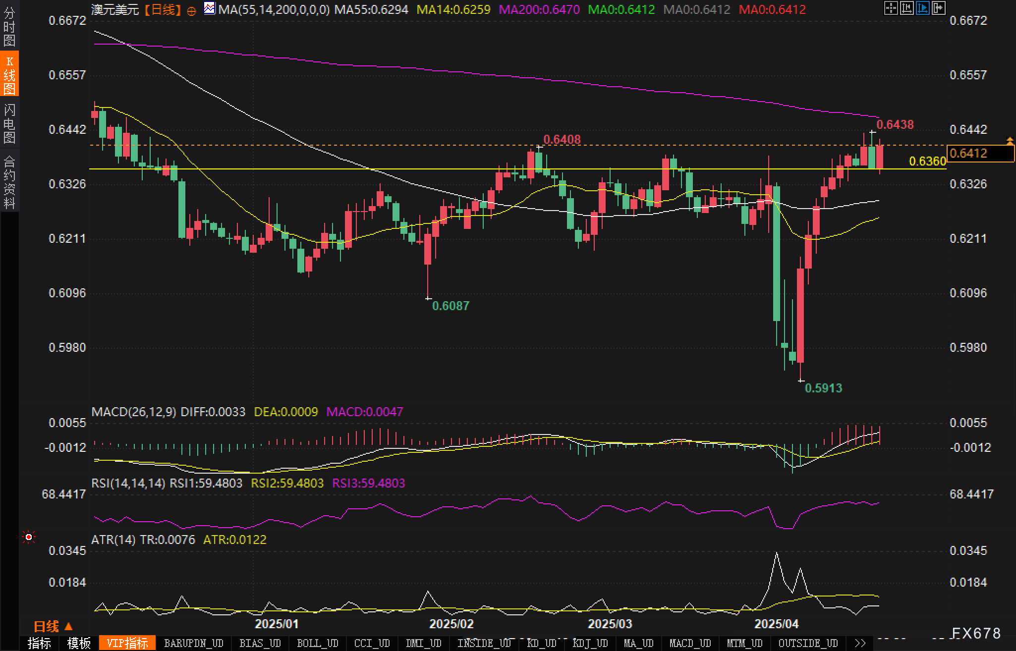 当前市场情绪明显倾向于风险偏好,特朗普政府释放的缓和信号以及总统放弃对美联储主席的批评,大幅提振了市场信心。澳元作为典型的风险货币,在这种环境下自然受益。特别是大宗商品价格的上涨,如铁矿石和铜的反弹,进一步支持了澳元走强的势头。RSI指标显示超买区域尚未达到,暗示多头仍有上升空间。