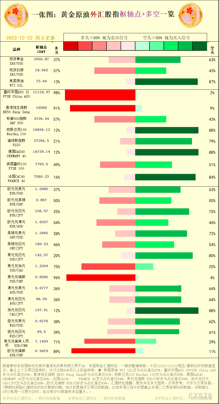 一张图:黄金原油外汇股指"枢纽点+多空占比"一览。今日(2023/12/22周五)最新出炉的数据显示,截止上个交易日结束时,头寸达到80%及以上的品种有:★ 美国原油 WTI OIL空头占比高达87%。富时中国A50 ☆FTSE China A50多头占比高达98%。香港恒生指数 HK50 Hang Seng多头占比高达91%。纳斯达克100 Nasdaq 100空头占比高达88%。德国DAX40GERMANY 40空头占比高达88%。法国CAC40FRANCE 40空头占比高达84%。美元兑瑞郎 USD/CHF多头占比高达96%。加元兑日元 CAD/JPY空头占比高达88%。欧元兑瑞郎 EUR/CHF多头占比高达89%。汇通财经提醒,更多详见本文图表。仅供参考,不作为交易依据。
