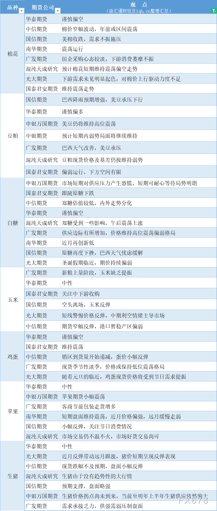 期货公司观点汇总一张图:12月22日农产品(棉花、豆粕、白糖、玉米、鸡蛋、生猪等)
