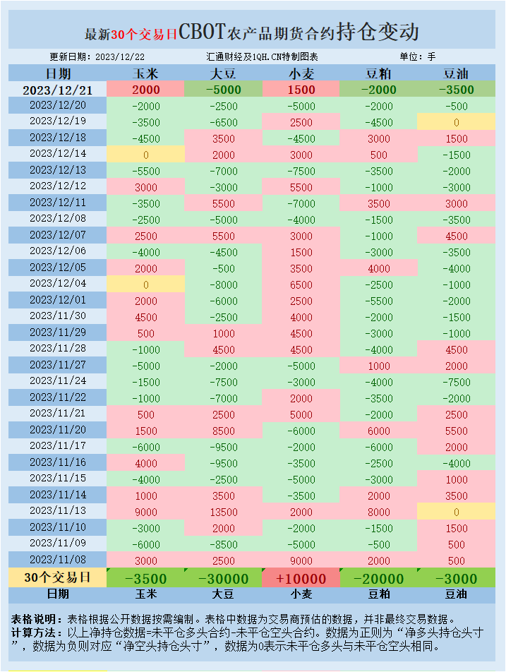 交易商估算的结果显示,大宗商品基金本周四(12月21日)增加小麦、玉米投机性净多头头寸,增加大豆、豆油、豆粕投机性净空头头寸。最新30个交易日,大宗商品基金增加豆油、玉米、豆粕、大豆、投机性净空头头寸,增加小麦投机性净多头头寸。