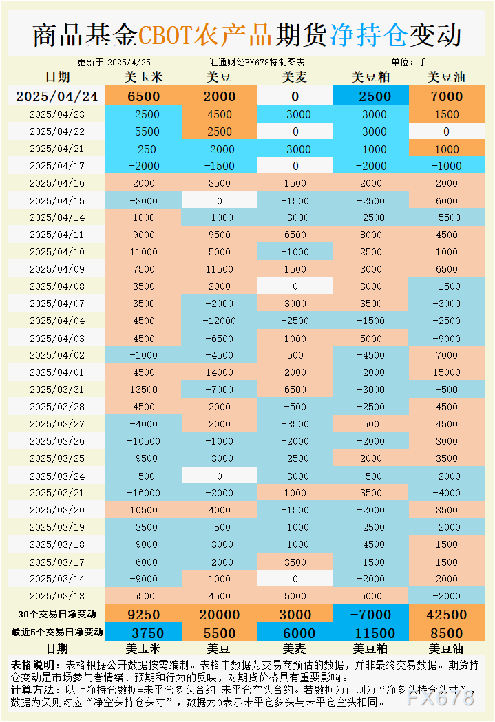 持仓数据显示,4月24日商品基金增加大豆投机性净多头2000手,最近5个交易日净多头增加5500手,过去30个交易日净多头累计增加2万手,表明基金对大豆价格看涨情绪增强。这种乐观情绪与基本面一致,关税言论的缓和降低了市场对出口不确定性的担忧。然而,南美大豆丰产预期可能限制价格上行空间。未来走势上,大豆期货短期内有望在10.50-10.80美元/蒲式耳区间震荡,若出口数据持续改善,可能进一步挑战11.00美元/蒲式耳关口。
