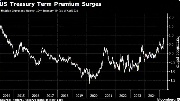 其结果是风险意识增强,导致债券买家质疑美债的传统避险地位,并要求期限更长的美债提供更高的收益率。从某种程度上说,这增加了缓冲,交易员称之为期限溢价,目前约为2014年以来的最高水平。