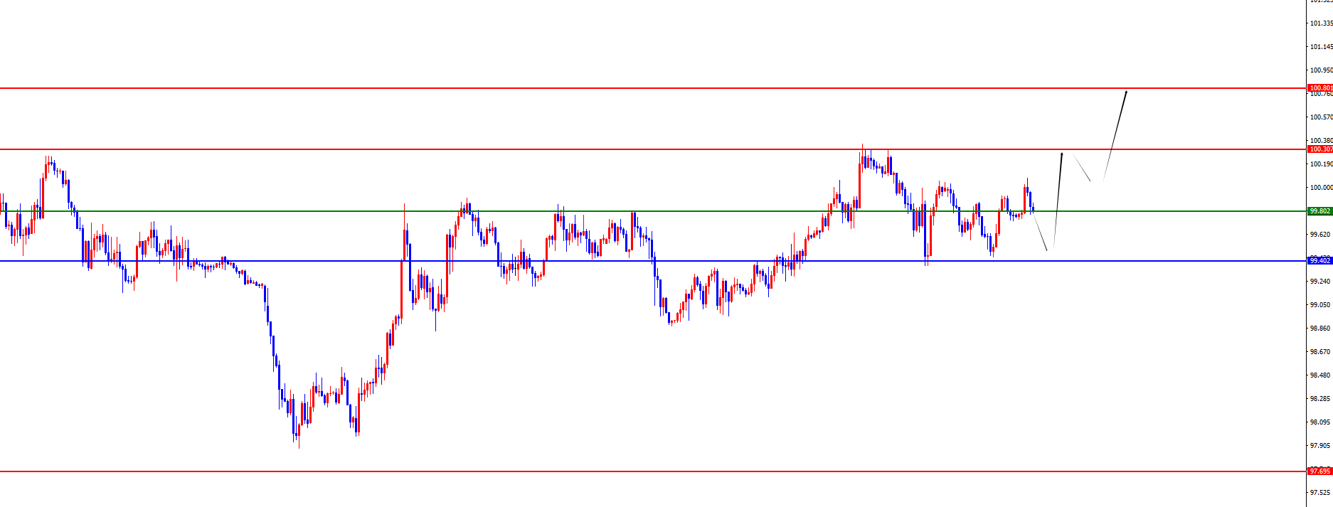 从多周期分析,周线级别来看价格压制在103.30区域阻力,那么从中期视角出发,美元指数的走势将更偏向于空头。在日线级别上价格站上99.40位置,那么从波段看价格已经突破并站稳日线阻力,则前期阻力变支撑,后续波段看多。短期四小时上看99.80区域支撑,价格在目前于四小时关键位置上下盘整,由于波段偏多,所以四小时上关注后续进一步突破站上四小时阻力,一旦站稳有望进一步发力。综合看价格只要在日线支撑上方则关注进一步震荡上涨,向上突破100.05位置则继续关注100.30-100.80区域。