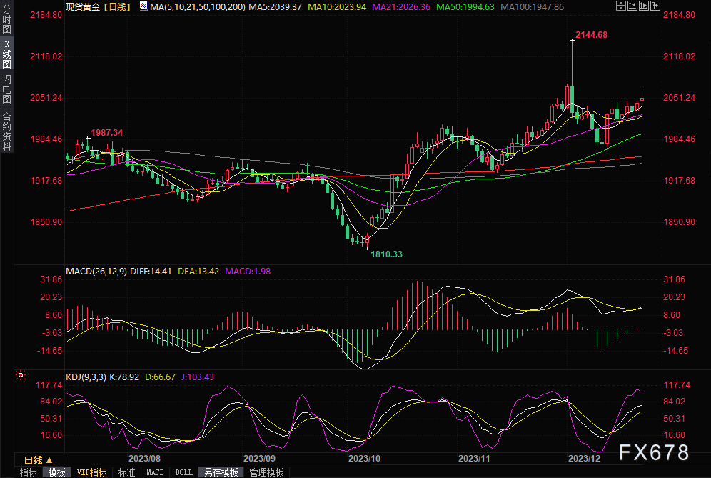 现货金价上周收盘高于重要心理关口2050美元,单周涨幅达到1.71%。