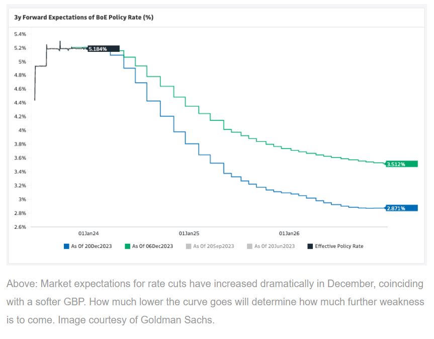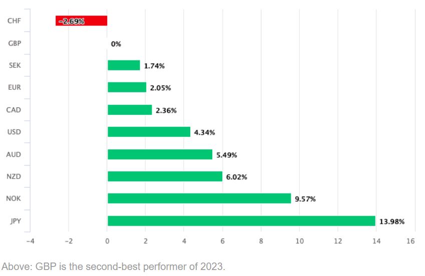 直到2023年8月,英镑是2023年表现最佳的主要货币,当时清晰的是通货膨胀将减缓,无需英国央行将利率提高到6.5%,并且当时货币市场暗示的也是这个水平。