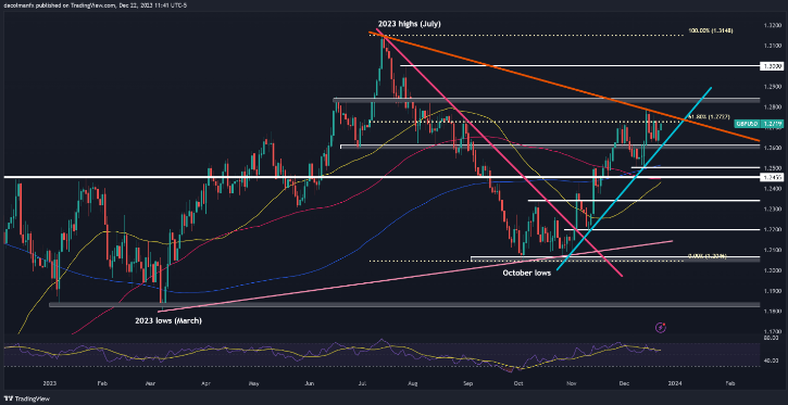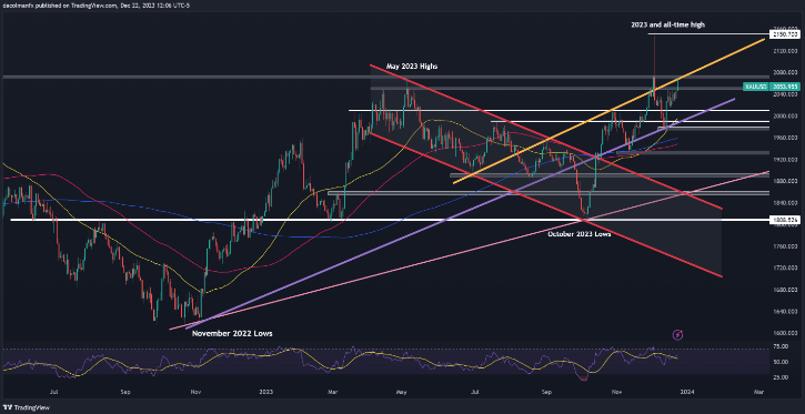 随着美国国债收益率偏下行以及华尔街充分展现市场繁荣,美元可能会加深近期回调。这可能会导致黄金、欧元/美元和英镑/美元在2024年之前进一步上涨。但投资者仍需谨慎,因为某些市场已接近潜在的超买水平。
