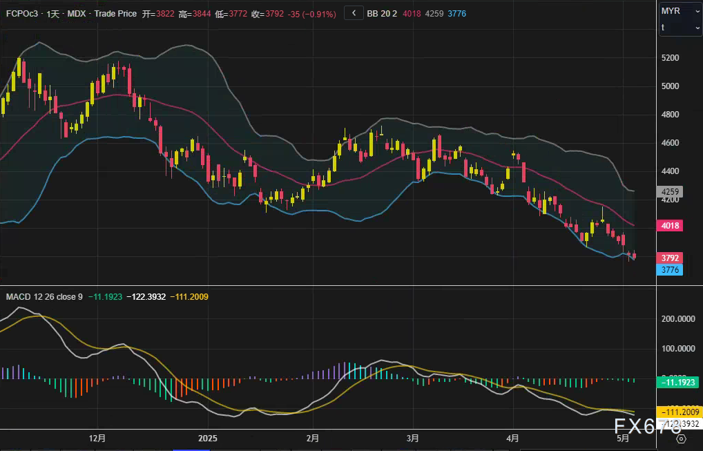 周二(5月6日),马来西亚衍生品交易所(BMD)7月交割的基准棕榈油期货合约(FCPOc3)收盘报3792林吉特/吨,较前一交易日下跌35林吉特,跌幅0.91%,创下连续第六个交易日回落。日K线显示,布林带(20,2)上轨4259、中轨4018、下轨3776,当前价格逼近下轨,MACD(12,26,9)指标呈死叉状态,快线-11.1923,慢线-122.3932,柱线-111.2009,技术面释放空头信号。市场受大连和芝加哥交易所竞品油脂价格走弱拖累,同时焦点转向5月生产展望,交易者对供需格局的重新评估成为驱动行情的关键。