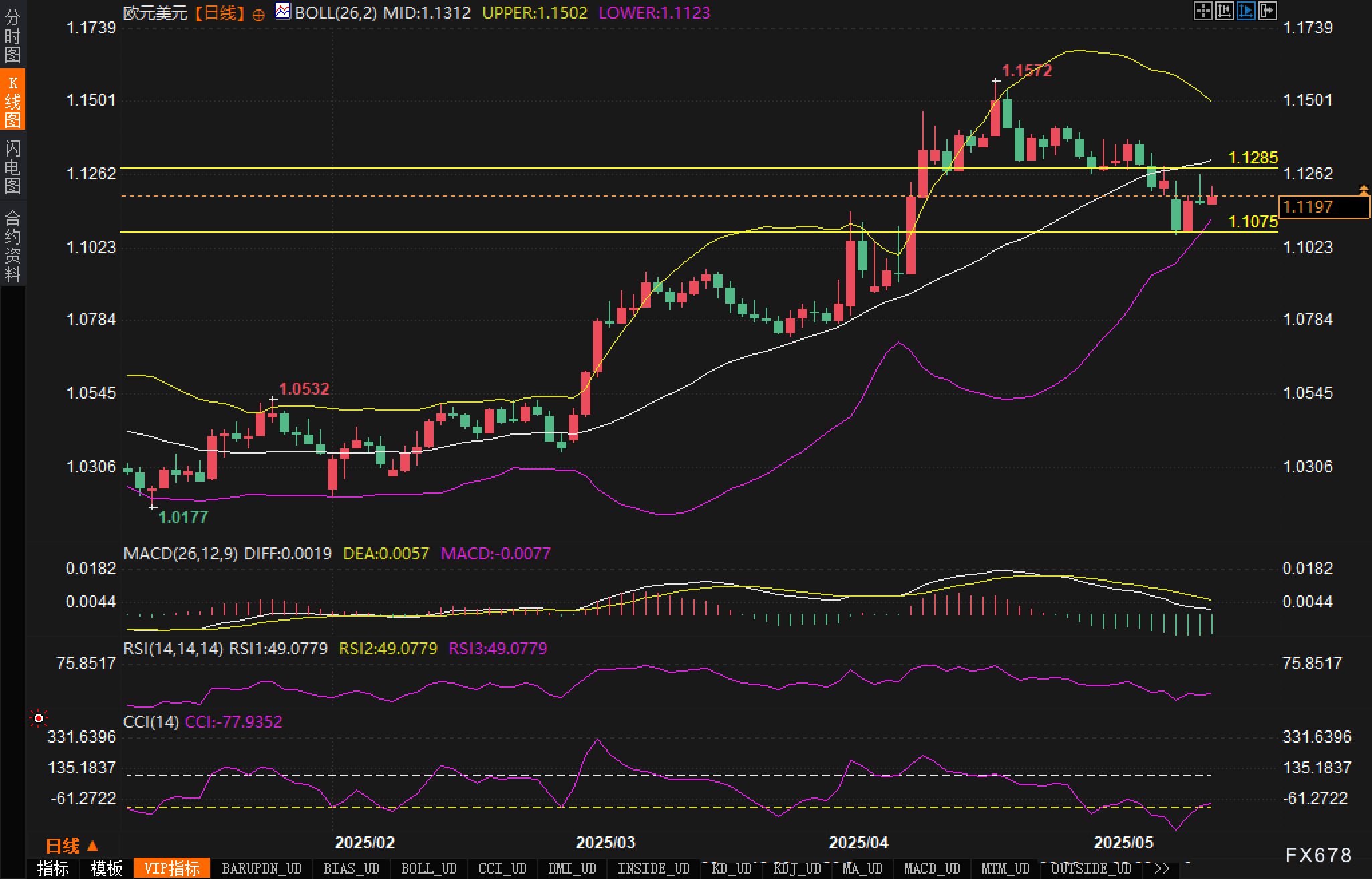 阻力方面,首要关注1.1285水平,这是近期横盘整理的上沿,其更上方是1.1500区域,接近4月高点。MACD指标显示负值-0.0077,不过柱状图呈现缩量下跌态势,表明空头压力依然存在但力度在减弱。RSI指标读数为49.0779,处于中性区域,暗示短期内汇价可能会在当前水平盘整。