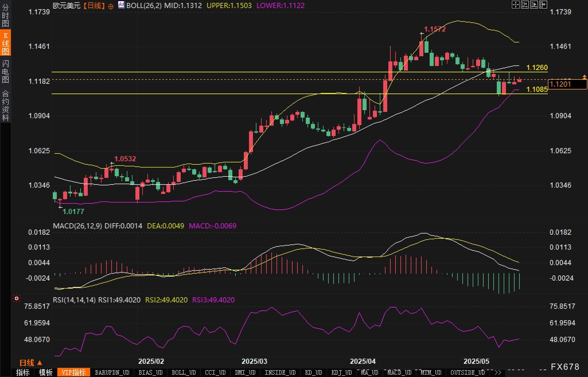 欧元兑美元日线图显示,汇价近期陷入盘整走势,以1.1200为中心展开区间震荡。从图表可见,汇价已从高点1.1572回落,并在1.1260和1.1085之间形成短期交易区间。