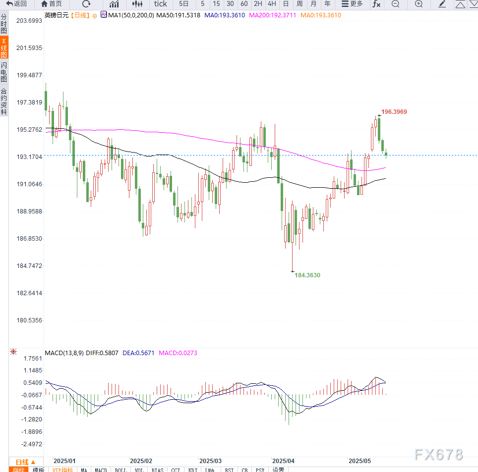 从日线图形来看,英镑兑日元(GBP/JPY)已连续第三个交易日下行,当前正在测试193.20-193.40区域的短期支撑带。技术面上,汇价已跌破5日与10日均线交汇处,动能指标MACD死叉持续放大,RSI指标也自高位回落至中性区域下方,显示空头正在逐步掌控节奏。
