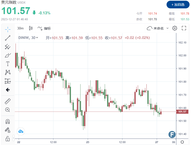 周二,美元指数当天下跌0.13%至101.57。该指数已从2022年9月28日的20年高点114.78回落,年跌幅约为1.84%。