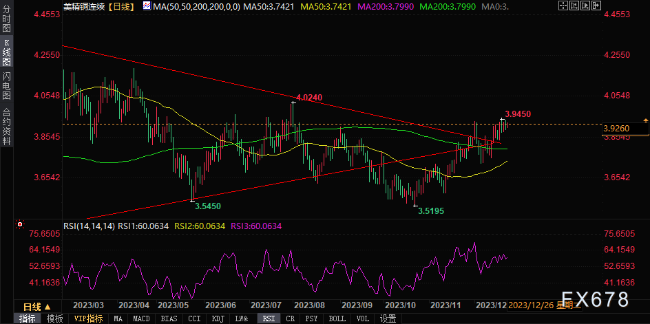 周二(12月26日),美精铜连续窄幅震荡,现报3.9180美元/磅,涨幅0.34%。